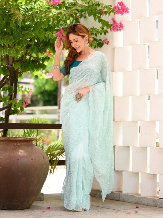 Sky Color Party Wear Saree in Georgette With Dual Sequence Work and Blouse